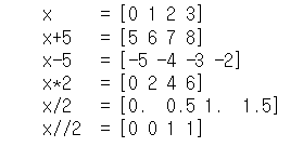 이러한 연산 속도를 더 빠르게 하기 위해서 필요한것이 바로 ufuncs 연산이다.#Numpy ufuncs는 파이썬 기본 산술연산자를 사용하기에 자연스럽게 사용할 수 있다. x = np.arange(4) print('x =' , x) print('x+5 =' , x+5) print('x-5 =' , x-5 ) print('x*2 =' , x*2) print('x/2 =' , x/2) print('x//2 =' , x//2) #배열안에 인자값에 연산한것을 확인할 수 있다.