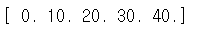 #출력지정 #대규모 연산인 경우 연산결과를 저장할 배열을 지정하는것이 유용할 때가 있다. #임시 배열을 생성하지 않고 지정한 배열을 이용해 원하는 메모리 위치에 직접연산 결과를 쓸 수 있다. #모든 ufuncs에서 함수의 out 인수를 사용해 출력을 지정할수있다. x = np.arange(5) y = np.empty(5) np.multiply(x,10,out=y) print(y)