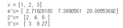 #지수 로그 x =[ 1,2,3] print('x =' , x) print('e^x=',np.exp(x)) print('2^x= ', np.exp2(x)) print('3^x= ' , np.power(3,x))
