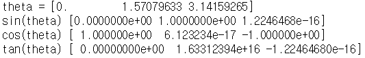 #삼각함수도 사용가능하다 . theta = np.linspace(0,np.pi,3) print('theta =', theta) print('sin(theta)' , np.sin(theta)) print('cos(theta)', np.cos(theta)) print('tan(theta)', np.tan(theta))