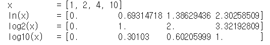 x = [1,2,4,10] print('x =',x) print('ln(x) =',np.log(x)) print('log2(x) =',np.log2(x)) print('log10(x) =' ,np.log10(x))