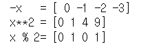 #음수를 만드는 단항 ufuncs와 지수 연산자 ** , 나머지 연산자 % 가 있다. print('-x =' ,-x ) print('x**2 =', x**2) print('x % 2=', x%2)