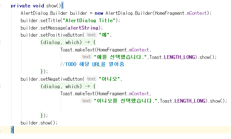 show 함수는 알렛 다이얼로그를 띄어주는 함수입니다 ..