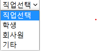 <select name="job"> <option value="">직업선택</option> <option value="학생">학생</option> <option value="회사원">회사원</option> <option value="기타">기타</option> </select>콤보 박스라고 불리는 셀렉트 박스 입니다.