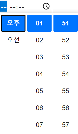 <form> <p><input type="time" /></p> <p><input type="submit" value="Submit" /></p> </form>시간을 입력받을 수 있는 입력형태입니다.
