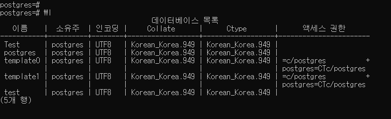 \l현제 존제 하는 모든 데이터베이스를 보여줍니다 MYSQL 로 보면 SHOW DATABASES; 같은 느낌입니다.