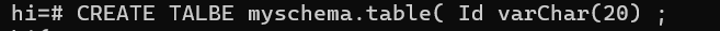 CREATE TABLE myschema.table (ID varChar(20)) ;스키마에 테이블을 만들어주는 명령어입니다..
