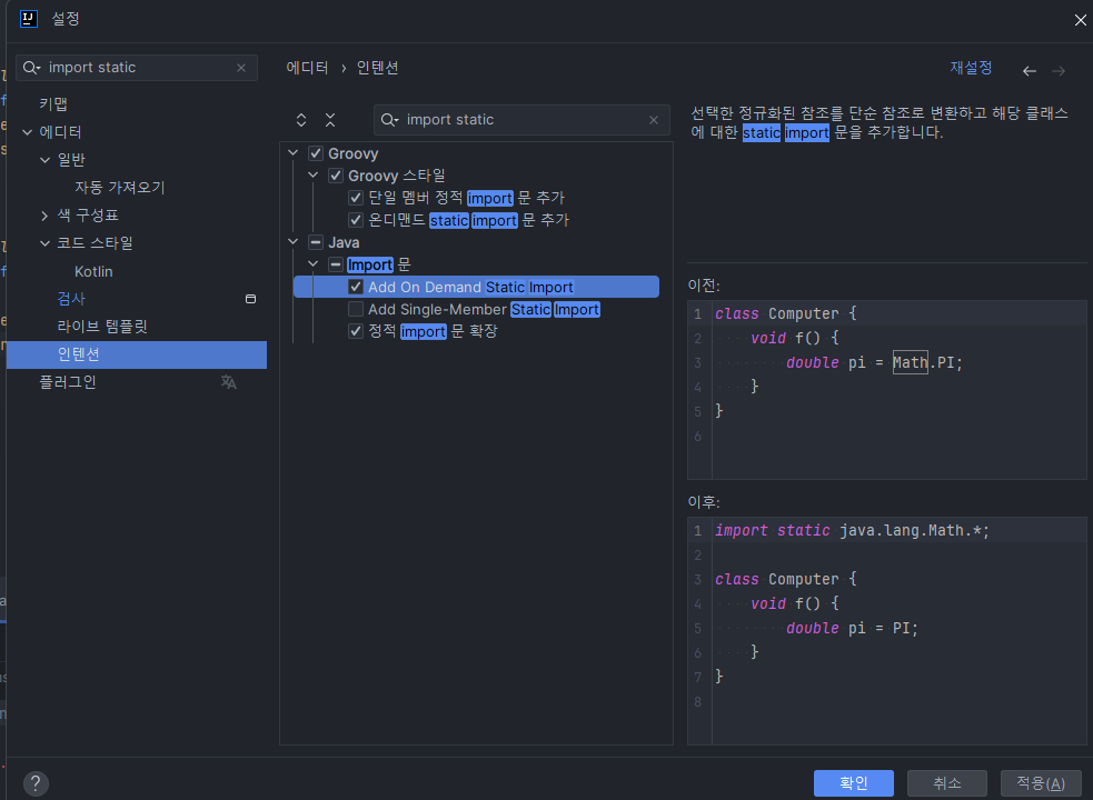 Add on Demand Static import 부분 체크박스 확인. 켜져있어야댐 /