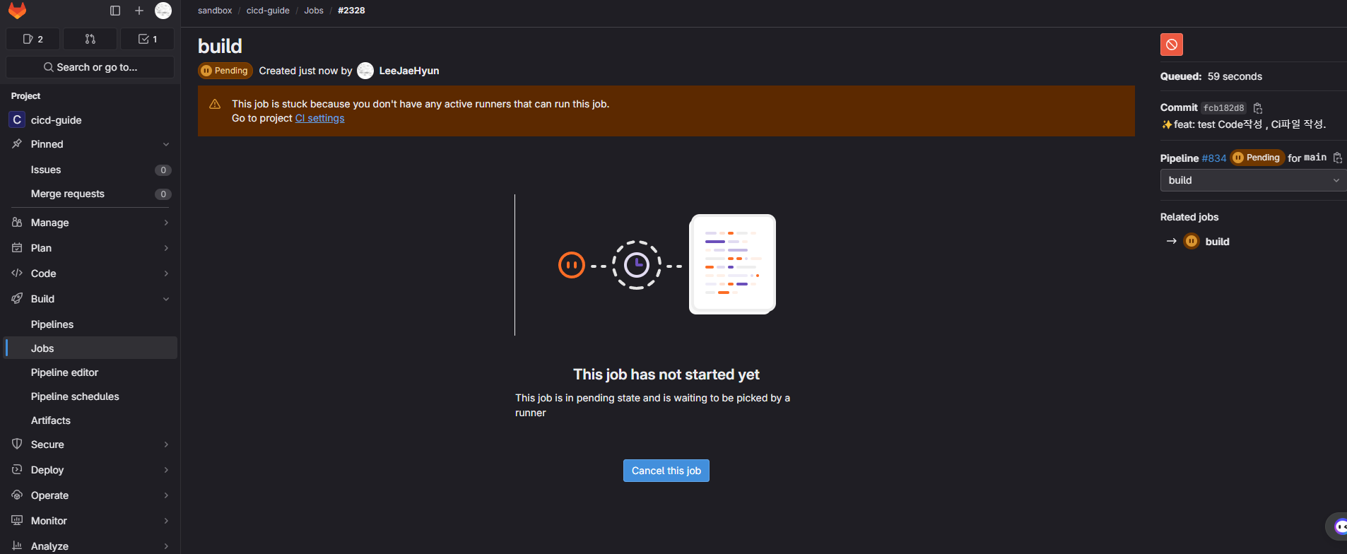 ci.yml→ 수정.gitlab-ci.yml로 해야함 (github랑 햇갈림 ;;`)시계모양 아이콘이 뜨면 정상적으로 적용 된걸 알 수 있다.
