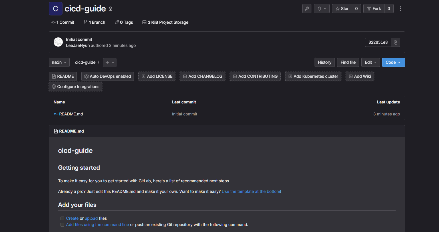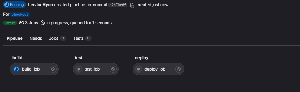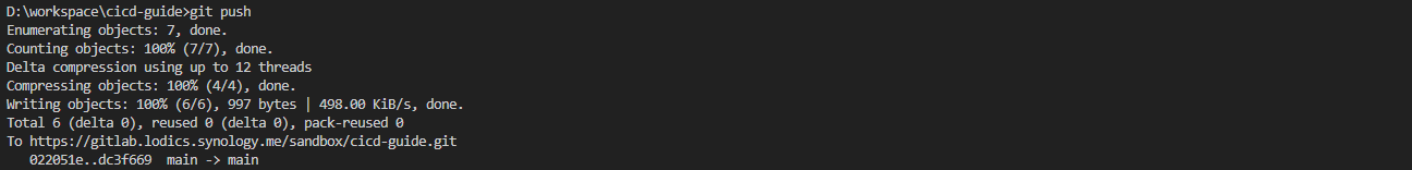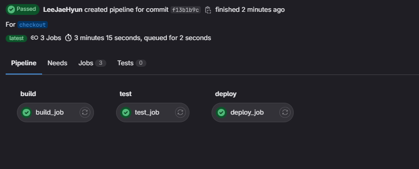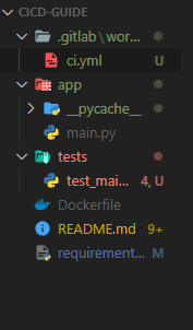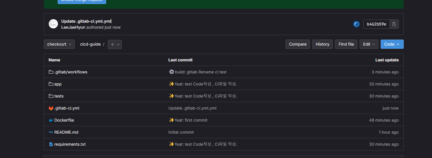 test_main.py# 경로를 잡아줘야대지만 연습용이라 무시함. import sys from os import path sys.path.append(path.dirname(path.dirname( path.abspath(__file__)))) import unittest from fastapi.testclient import TestClient from app.main import app class TestApp(unittest.TestCase): def setUp(self): self.client = TestClient(app) def test_read_root(self): response = self.client.get("/") self.assertEqual(response.status_code, 200) self.assertEqual(response.json(), {"message": "Hello, World!"}) def test_read_item(self): response = self.client.get("/items/1") self.assertEqual(response.status_code, 200) self.assertEqual(response.json(), {"item_id": 1, "q": None}) def test_read_item_with_query_param(self): response = self.client.get("/items/1?q=test") self.assertEqual(response.status_code, 200) self.assertEqual(response.json(), {"item_id": 1, "q": "test"}) if __name__ == "__main__": unittest.main()ci.yml# .gitlab-ci.yml # MEREGE checking # 파이프라인을 어떤 러너를 사용하여 실행할 것인지 정의합니다. # 여기서는 도커 러너를 사용합니다. image: docker:latest # 작업의 정의는 stages 섹션에 있습니다. stages: - build - test - deploy # 각 작업은 jobs 섹션에서 정의됩니다. # 이름을 부여하고 해당 작업이 속하는 단계를 지정합니다. # 스크립트는 해당 작업이 수행할 명령을 포함합니다. build_job: # 도커 파일을 빌드합니다. stage: build script: - ls - docker info - docker build -t cicd:latest . # 테스트 코드를 실행합니다. test_job: services: - docker:dind stage: test script: - python tests/test_main.py # 테스트가 완료되면 배포 작업을 해줍니다. #TODO Docker hub 연동. deploy_job: services: - docker:dind stage: deploy script: - docker run -it -d -p 38000:80 cicd:latestpush