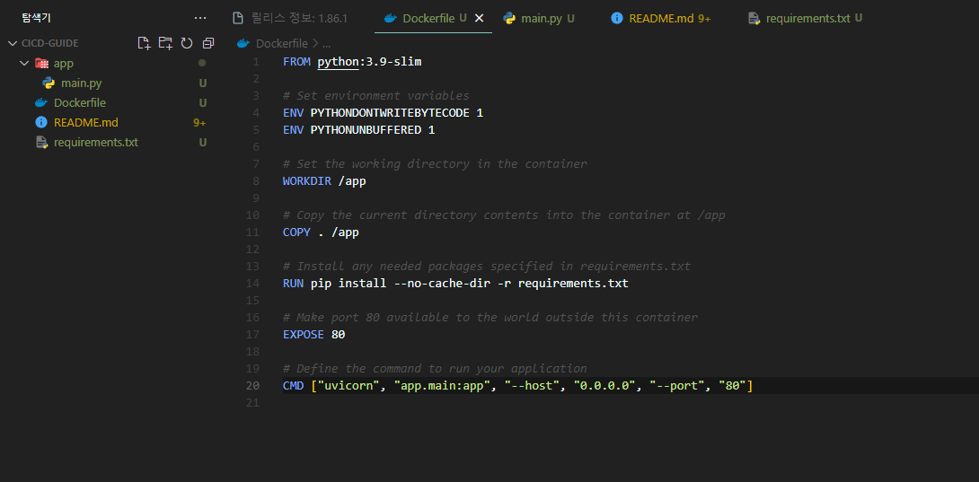 Dockerfile구성FROM python:3.9-slim # Set environment variables ENV PYTHONDONTWRITEBYTECODE 1 ENV PYTHONUNBUFFERED 1 # Set the working directory in the container WORKDIR /app # Copy the current directory contents into the container at /app COPY . /app # Install any needed packages specified in requirements.txt RUN pip install --no-cache-dir -r requirements.txt # Make port 80 available to the world outside this container EXPOSE 80 # Define the command to run your application CMD ["uvicorn", "app.main:app", "--host", "0.0.0.0", "--port", "80"]requirements구성fastapi==0.70.0 uvicorn==0.15.0main.app구성.from fastapi import FastAPI # Create an instance of the FastAPI class app = FastAPI() # Define a route @app.get("/") async def read_root(): return {"message": "Hello, World!"} # Define another route @app.get("/items/{item_id}") async def read_item(item_id: int, q: str = None): return {"item_id": item_id, "q": q}커맨드 실행.