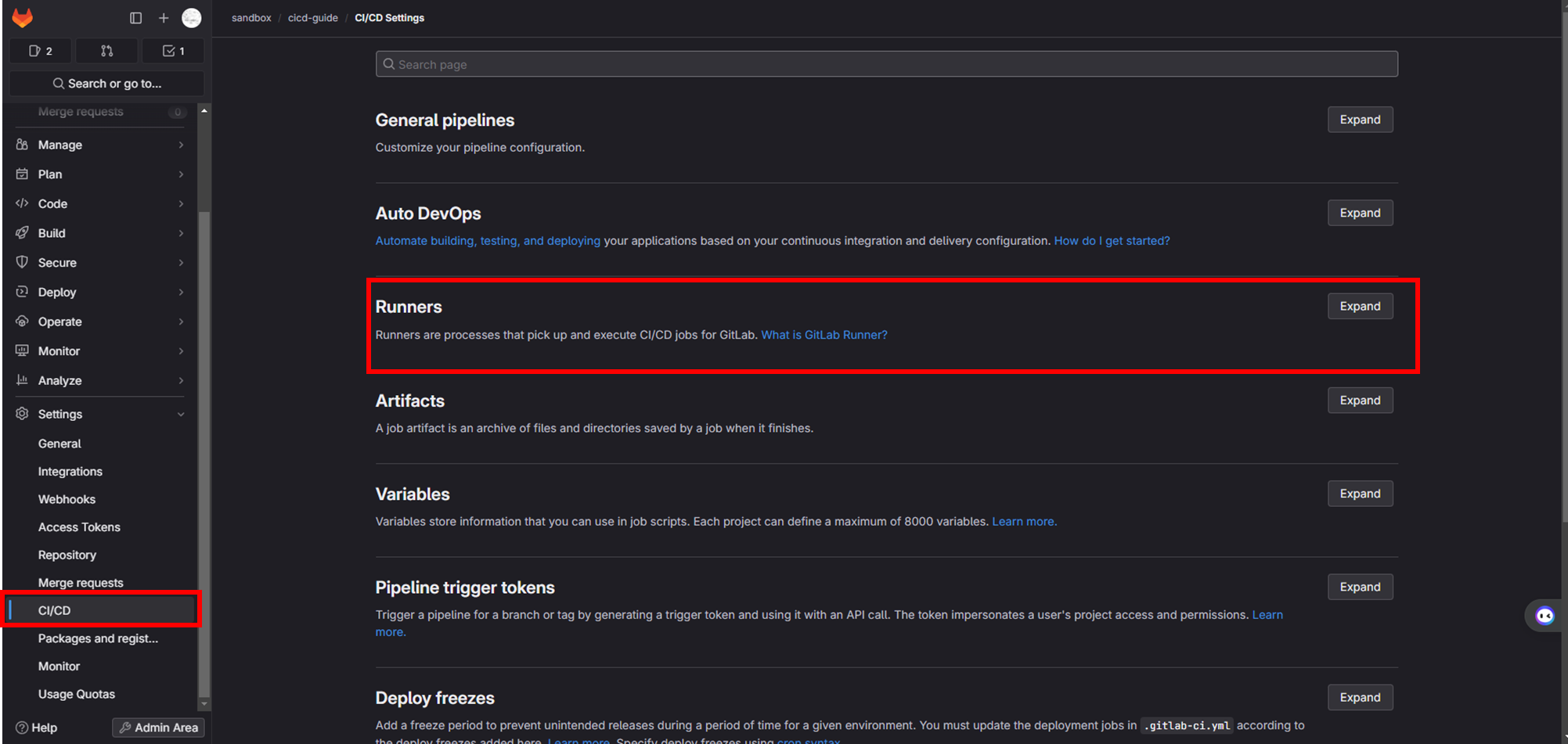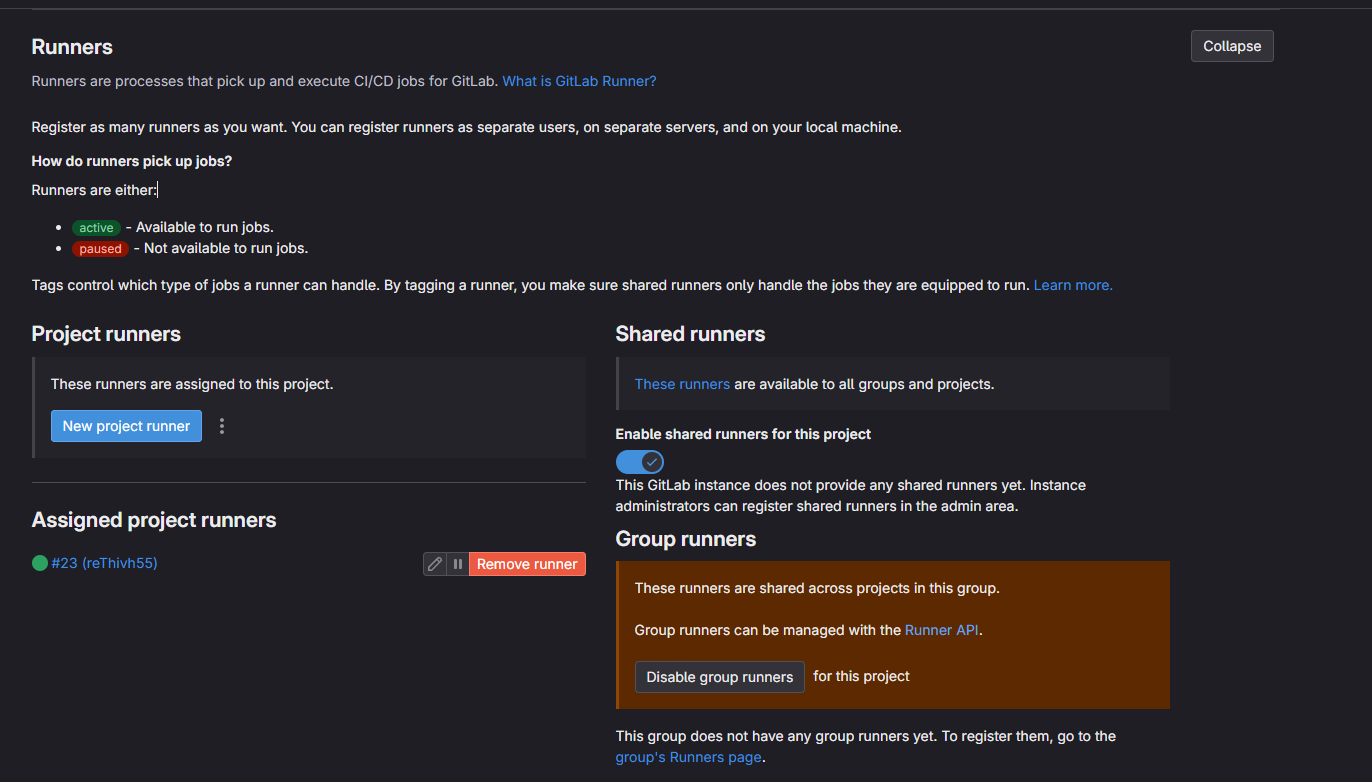 Sttings/CI/CD → runners 이동
