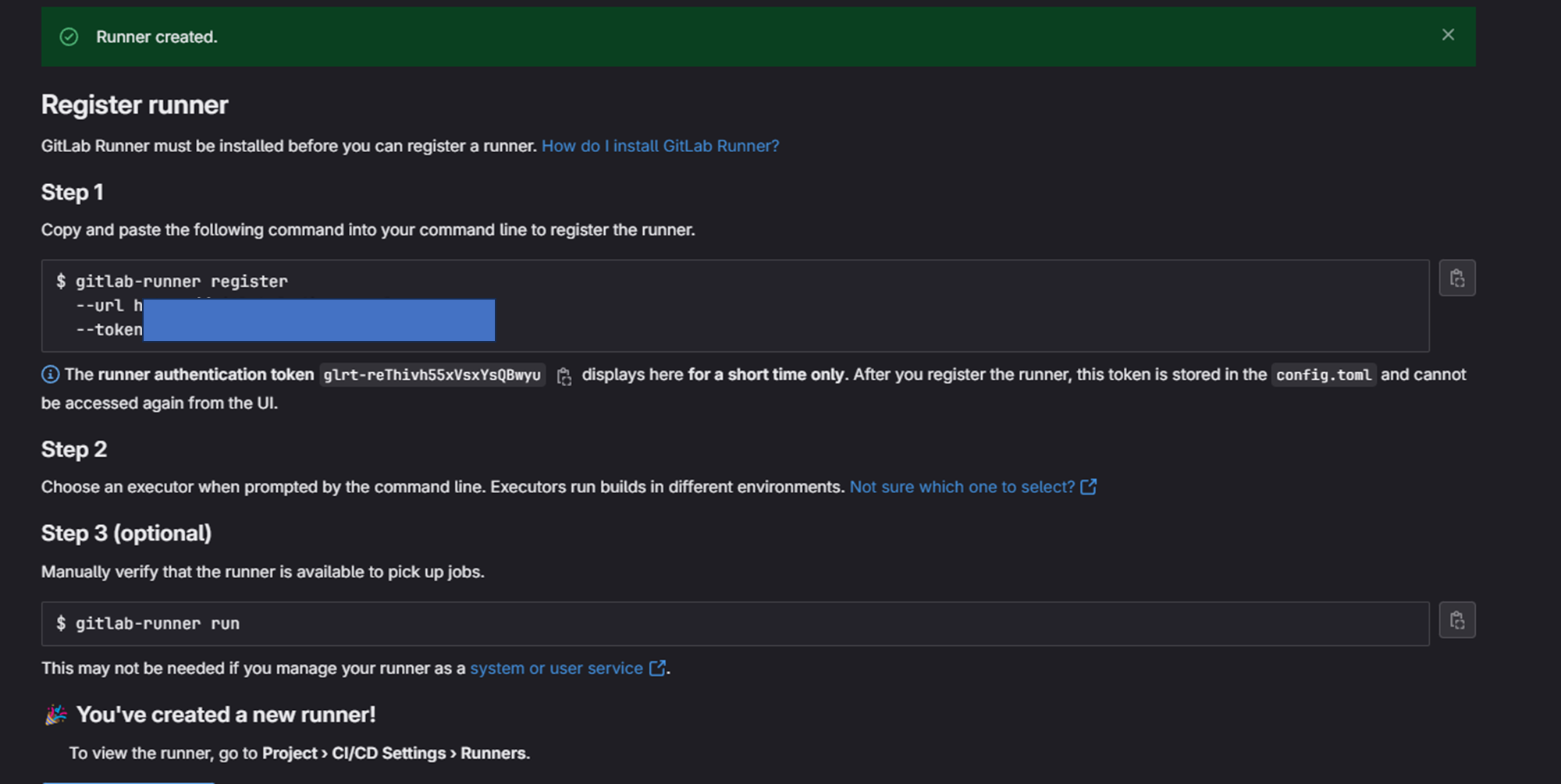 docker run -d --name gitlab-runner2 --restart always \ -v /srv/gitlab-runner/config:/etc/gitlab-runner \ -v /var/run/docker.sock:/var/run/docker.sock \ gitlab/gitlab-runner:v16.7.1 docker exec -it gitlab-runner2 bash gitlab-runner register --url Step1 값 --token Step1값.