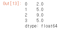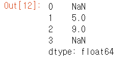 #둘 중 하나라도 값이 없는 항목은 NaN 으로 처리된다 . A = pd.Series([2,4,6] , index=[0,1,2]) B = pd.Series([1,3,5] , index=[1,2,3]) A+B