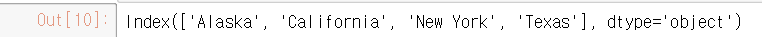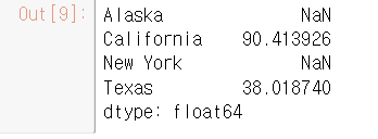 #유니버설 함수 : 인덱스 정렬 #두 개의 Series 또는 DataFrame 객체에 이항 연산을 적용하는 경우 #Pandas는 연산 수행과정에서 인덱스를 정렬한다 .area = pd.Series({'Alaska' : 172337 , 'Texas' : 695662 , 'California' : 423967} , name='area' ) population = pd.Series({'California' : 38332521 , 'Texas' : 26448193, 'New York': 19651127 }, name='population')#결과 배열은 두 입력 배열의 인덱스의 합집합을 담고 있다. population/area