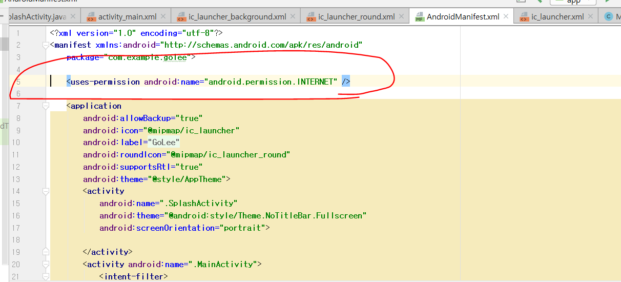 먼저 안드로이드 Mainfest 에서 권한(인터넷)을 추가해주고