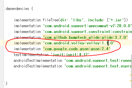 volley라이브러리를 추가하기위해 implementation 을 사용하였습니다 .